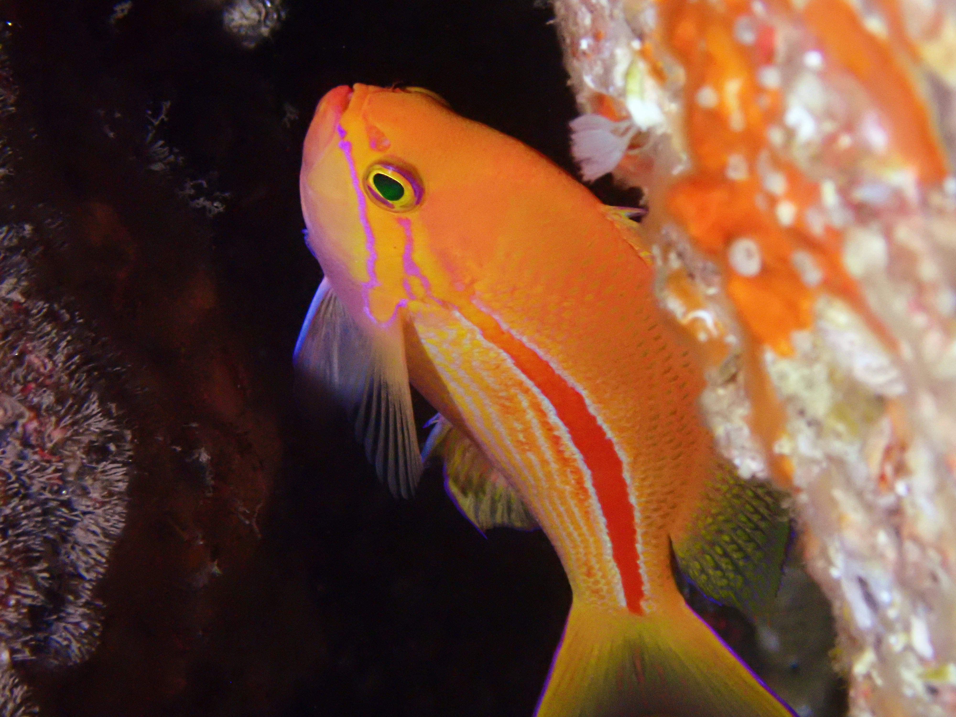 いつもの場所の下の穴に綺麗なスジハナダイが。穴の中、岩の割れ目に入ってじーっと動かないのでじっくり見させてもらいました。やっぱりハナダイはみんな綺麗ですね!