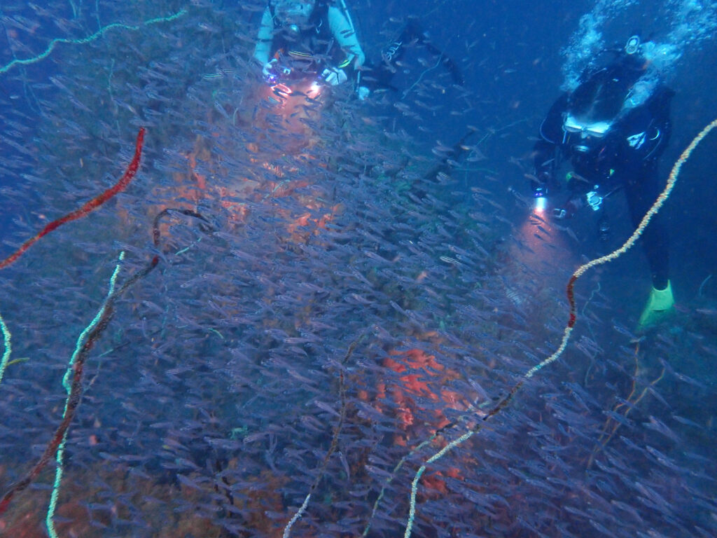 今日は2本とも久しぶりに通り崎「お花畑」の深場へ行って来ましたが、去年までキンメモドキがグッチャリ群れていた場所に、今年はネンブツダイが視界を塞ぐほど群れていて、ここ数日、群れまくっているキビナゴと混ざってすごいことに。去年のキンメモドキ、今年のネンブツダイと他の魚にとって(特にハタ系とミノカサゴ)とっても食料豊富な良い場所となっているようで、今日もとっても賑やか!