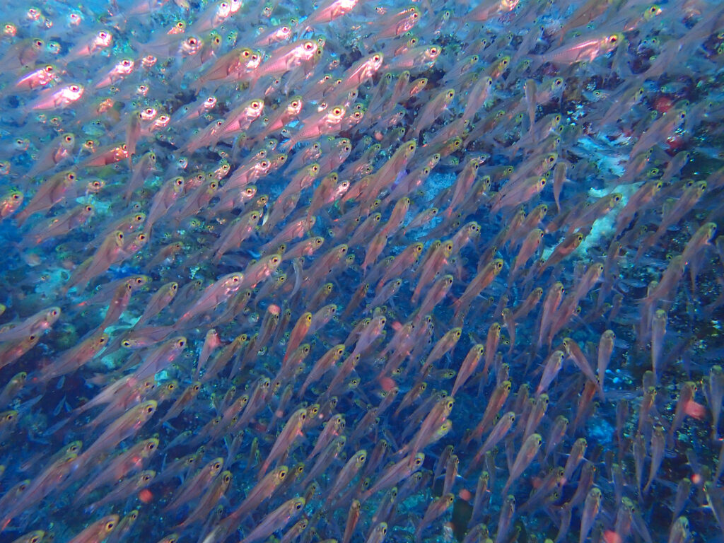 今日も群れ群れだった沖魚礁。すごい数で固まっているマアジを狙ってワラサやイナダがぐるぐる回ってます。空に浮かぶ雲のようにかたまってるネンブツダイたちの群れは相変わらずですし(むしろ増えたような気がします)、一時“いなくなった???”って思ったキンメモドキも健在でした。